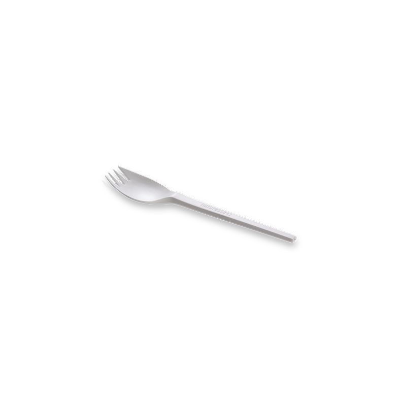 CPLA Spork (Gaffelske) 124mm, i farve hvid. Artiklen er biologisk nedbrydelig og kan gå på kompost, biogas eller bortskaffes på traditionel vis. Slank og elegant design der tåler kontakt med varme retter. CPLA er modificeret PLA - således produktet er mere varmestabil. CPLA Spork 124mm